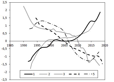 Fig. 6.  Smoothed trajectories of changes in environmental factors and phytoplankton indicators (standardized values).         1 – total phosphorus, 2 – water color, 3 – annual volume of wastewater from the Petrozavodsk industrial center, 4 – chlorophyll a, 5 – diatoms biomass