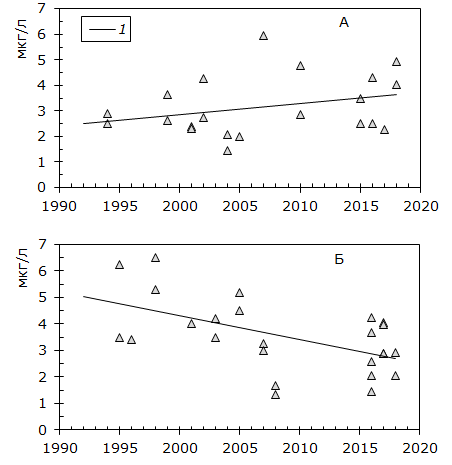 Fig. 4. Long-term dynamics of chlorophyll a content in the photic layer of Petrozavodskaya Bay in the spring (A) and summer (Б), μg/l. 1 – trend line