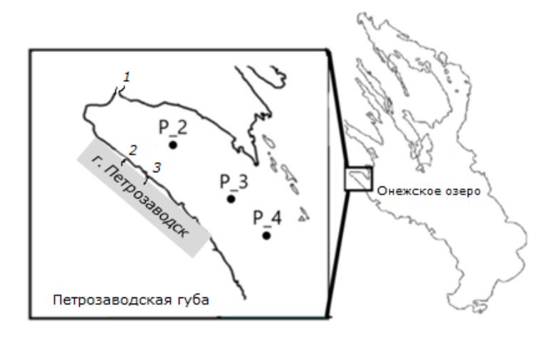 Fig. 1. Schematic map of the Petrozavodskaya Bay of Lake Onego with the location of sampling stations. 1 – Shuya River, 2 – Neglinka River, 3 – Lososinka River