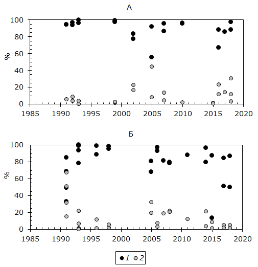 Fig. 3. The proportion of diatoms and non-diatoms in the phytoplankton biomass of Petrozavodskaya Bay in spring (A) and summer (Б), %. 1 – diatom phytoplankton, 2 – non-diatom phytoplankton