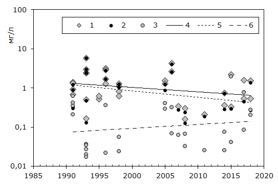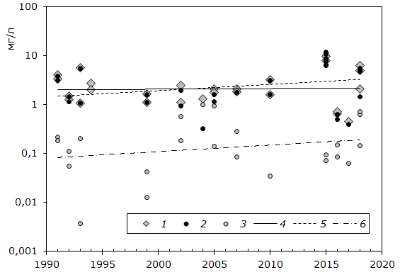 Fig. 5. Long-term dynamics of the average phytoplankton biomass in the photic layer of Petrozavodskaya Bay in the summer, mg/l. 1 – total phytoplankton biomass, 2 – diatom biomass, 3 – non-diatom biomass, 4 – trend line of total biomass , 5 – trend line of diatom biomass , 6 – trend line of non-diatom biomass