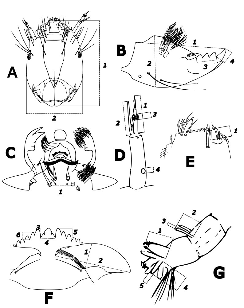 Рис. 1. Схематическая иллюстрация промеров органов личинок комаров-звонцов (рис. по: Wiederholm, 1983). A. Головная капсула. 1 – длина, 2 – ширина. B. Мандибула. 1 – длина, 2 – ширина, 3 – ширина внутренних зубов мандибулы, 4 – длина апикального зуба. C. Верхняя губа. 1 – расстояние между щетинками SII. D. Антенна. 1 – длина жгутика (2–5 членик), 2 – длина сенсиллы, 3 – длина лаутерборновых органов, 4 – диаметр кольцевого органа. E. Максилла. 1 – длина щупика максиллы. F. Ментум. 1 – высота вентроментальной пластинки, 2 – ширина вентроментальной пластинки, 3 – длина срединного зуба, 4 – ширина срединного зуба, 5 – длина первого бокового зуба, 6 – длина второго бокового зуба. G. Задняя часть тела личинки. 1 – длина задних подталкивателей, 2 – длина вентральных отростков, 3 – ширина (диаметр) вентральных отростков, 4 – длина анальных жабр, 5 – ширина (диаметр) анальных жабр
