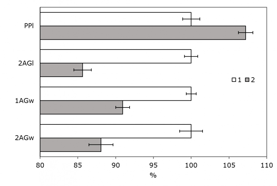 Fig. 3. Comparison of the sizes of the organs of the posterior part of the body of E. pagana larvae at a depth of 2 and 4 m (% of the size of the measured organ in the larva from a depth of 2 m, p < 0.01) and the error of the average value: 1 – a depth of 2 m, 2 – a depth of 4 m. PPl – the length of the posterior pusher; 2AGl –the length of the second anal gills; 1AGw – the width of the first anal gills; 2AGw – the width of the second anal gills.