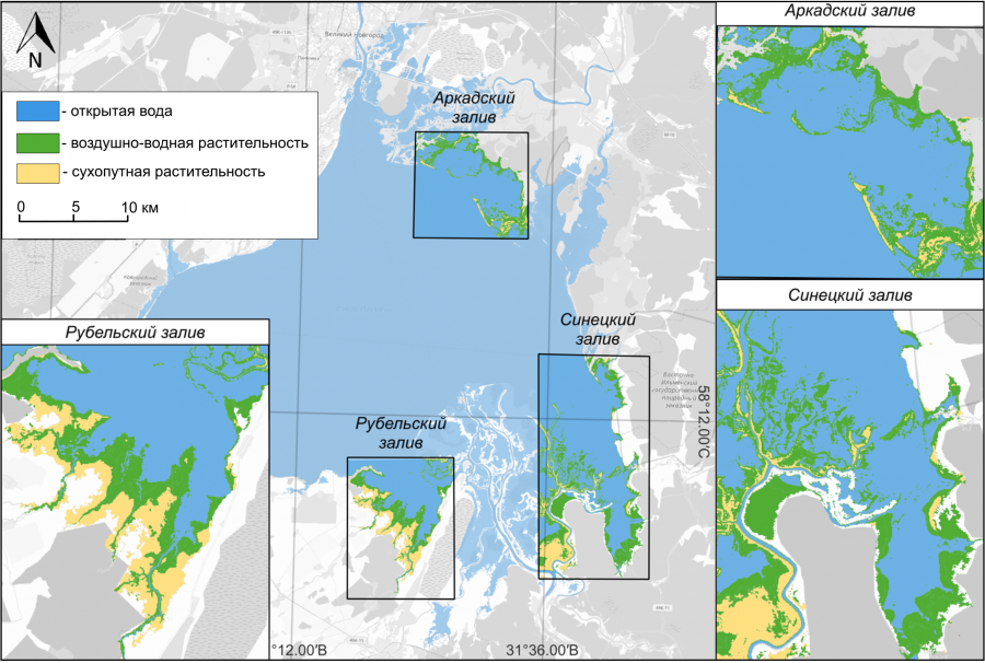 В качестве границ анализа ДЗЗ использованы крупные заливы (Аркадский, Синецкий и Рубельский) оз. Ильмень при максимальном уровне воды за исследуемый период (рис. 1).