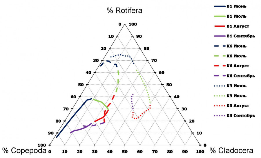 Сезонные изменения видового состава зоопланктона лежат в основе динамики соотношения основных его групп. Общие закономерности сезонных изменений структуры сообществ зоопланктона, без влияния межгодовой изменчивости, можно представить в виде треугольной диаграммы (рис. 2). Детализация диаграммы сезонных изменений структуры сообществ по месяцам вегетационного периода представлена в табл. 2–5.