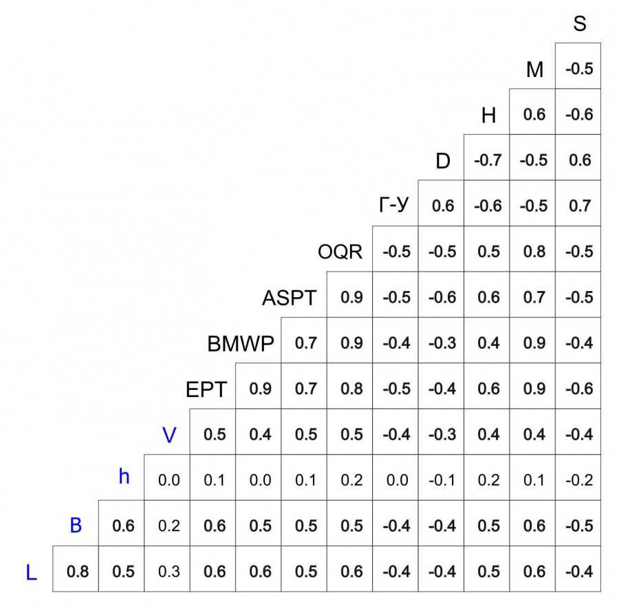 Гидрологические характеристики водотока (длина, ширина и скорость течения) демонстрируют достоверную корреляционную связь со всеми индексами (см. рис. 2). При этом положительная корреляция отмечена между данными гидрологическими параметрами и индексами EPT, BMWP, ASPT, OQR, H, M; отрицательная – с индексами Г–У, D и S. Глубина водотоков значимой корреляционной связи с индексами не имела.