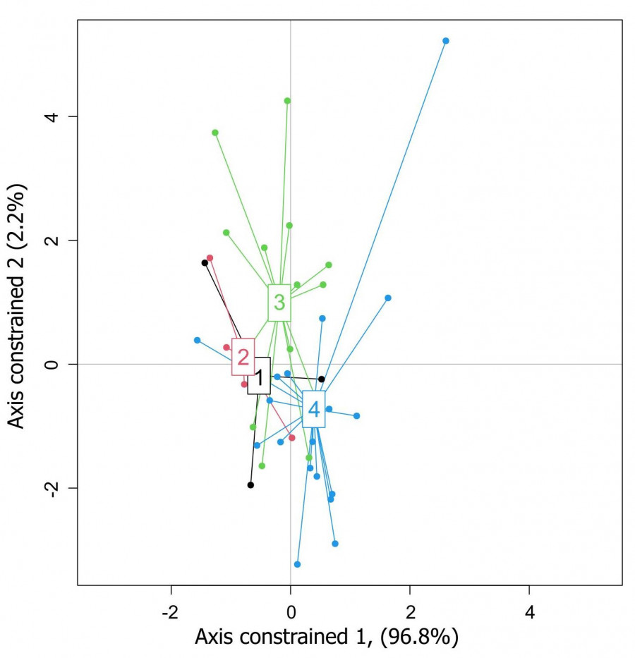 Рис. 4. Группировка рек в зависимости от типа субстрата методом RDA (глинистый – 1, илистый – 2, песчаный – 3, каменистый – 4)