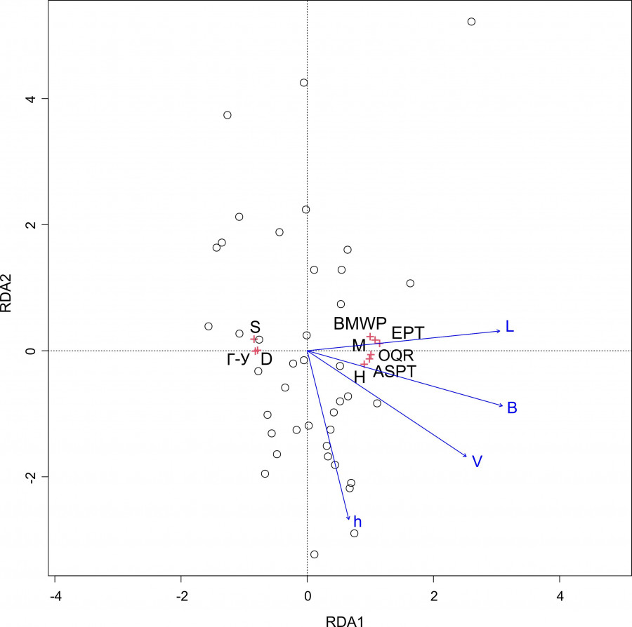Для интерпретации связей значений биотических индексов от гидрологических особенностей рек выполнен анализ избыточности (RDA). Анализ избыточности выполнен для модели, где в качестве предикторов для биотических индексов используются показатели длины реки и ширины, глубины, скорости течения на месте отбора проб. Наилучший результат был получен в модели из комбинации суммы показателей: длины реки, ширины, глубины и скорости течения (рис. 3). Модель была статистически значима (пермутационный тест, p < 0.0001). Точками на рисунке показаны станции на реках, крестиками – показатели биотических индексов, стрелками – факторы среды. В данной модели первая каноническая ось (RDA1) описывает 45.7 % суммарной изменчивости, RDA2 – 54.3 %. Значимость эффекта воздействия факторов определялась тестом по F-критерию с использованием рандомизации. В модели из суммы четырех факторов три имеют значимое влияние: ширина реки – p < 0.001, глубина и скорость течения – p < 0.01. Общая направленность RDA1 с показателями длины реки, ширины и скорости течения дает возможность предположить ведущее значение комплекса данных факторов в формировании величины биотических индексов.