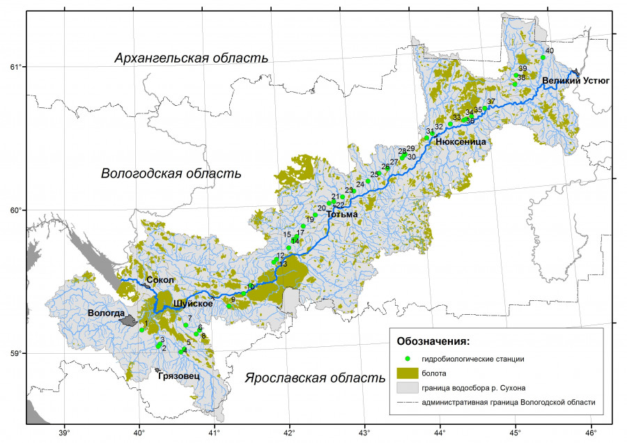 Река Сухона является крупнейшей на территории Вологодской области, водосбор ее составляет около трети от площади региона. Длина реки составляет 558 км. Площадь водосбора 50300 км2 (Болотова и др., 2007), относится к бассейну Белого моря. Река имеет 70 притоков I порядка. На своем протяжении бассейн р. Сухоны охватывает 13 ландшафтных районов, принадлежащих к Сухона-Двинской физико-географической области Восточно-Европейской равнины (Максутова, Воробьев, 2007): Кубеноозерский, Прикубенский, Харовский, Кулойский, Нижнесухонский, Устьянский, Мало-Двинский, Вологодско-Грязовецкий, Верхнесухонский, Авнигский, Галичский, Кичменгский, Среднеюгский. В настоящей работе исследованы притоки р. Сухоны I–IV порядков разной протяженности. Территория Вологодской области расположена в таежной зоне, на стыке южной и средней ее подзон. Рассматриваются реки, расположенные в обеих подзонах тайги. Территория Европейского Севера характеризуется умеренным уровнем антропогенной нагрузки, носящей, как правило, локальный характер, проявляющийся в виде сбросов отдельных предприятий. Большая часть водосборов исследованных рек покрыта лесом, высокую долю составляют болота (Филоненко, Филиппов, 2013). Ряд исследованных рек протекает вблизи крупных населенных пунктов: городов Вологда и Тотьма, поселка Юбилейный, сел Шуйское и Нюксеница.