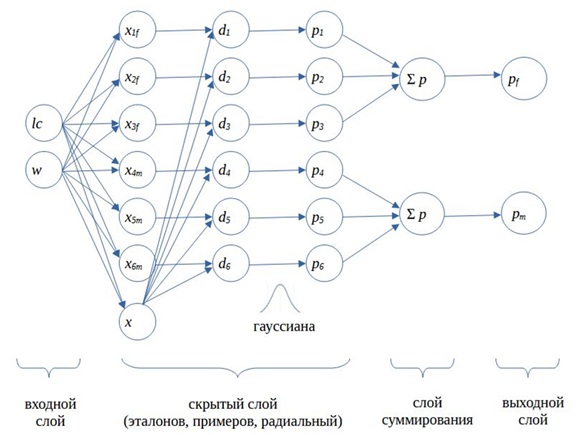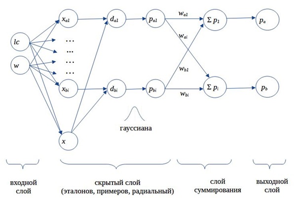 Вообще говоря, в литературе приводится большое разнообразие формул для расчета гауссианы, которые отличаются от представленной в основном нормировочными коэффициентами перед экспонентой. Однако, как указывает D. F. Specht (1990), не было доказано, что какая-то из них является наилучшей, и мы в нашей модели использовали простейшую.