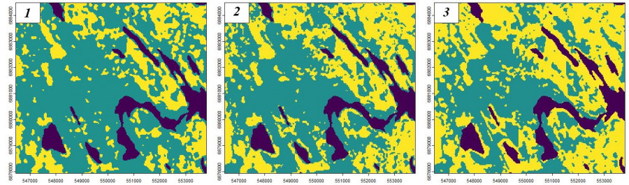 Fig. 16. Options for interpreting space images with different RBF parameters: s = 0.01, E = 0.92 (1); s = 0.02, E = 0.92 (2); s = 0.2, E = 0.88 (3); notation as in Fig. 14