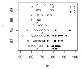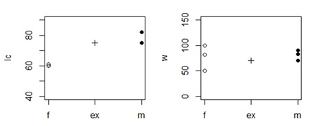 Итак, поставлена задача: требуется определить пол особи обыкновенной гадюки по морфологическим признакам (длина хвоста lc = 73 мм, масса w = 70 г), используя выборку особей, для которых известен пол, s (для начала подобраны особи с одинаковой длиной тела lt = 50 см).