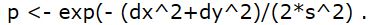 ( p<-exp(-(dx^2+dy^2)/(2*s^2)) )