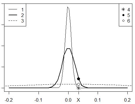 Fig. 15. Gaussians (normal distributions) constructed for standards x with different variances: s = 0.01 (1), s = 0.02 (2), s = 0.2 (3); estimates of p values from Gaussians with variances s = 0.01 (3), s = 0.02 (4), s = 0.2 (5)