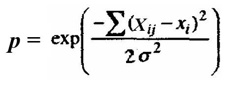 где Xij − значения показателей тестируемого образца, xi − эталонные образцы, σ − стандартное отклонение, или в формате R (для каждого эталона):![]()