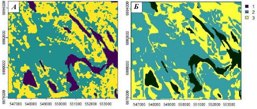 Fig. 14. A grid of the results of interpretation of three landscape elements in the work area (1 – lake, 2 – secondary, meadows, swamps, 3 – mature forests) for 2013 (А) and a cartogram of clearings over the past 70 years up to 2023 (Б)
