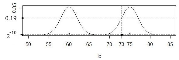 Fig. 4. The location of the studied specimen (lcX = 73 mm) relative to the kernels (s = 2) for two reference samples lcx = 60 (female) and lcx = 75 mm (male)