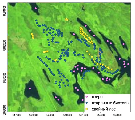 В качестве второго примера использования вероятностной нейронной сети в экологии рассмотрим задачу дешифрирования спутниковой информации. Изучаемый район имеет площадь около 10 кв. км. На территории постоянно ведутся рубки, формируя сложную мозаику разнообразных биотопов. Поставлена задача выявить остатки спелых хвойных и смешанных лесов. В среде QGIS космический снимок для 2013 г. был обрезан по границам района работ ("2013.tif"). Полевые работы и анализ снимков высокого разрешения позволил на отдельном слое poi.csv отметить 299 точек для трех элементов ландшафта: 1 − озера, 2 − безлесые пространства, вырубки и вторичные леса, 3 − спелые хвойные и смешанные леса (рис. 12).