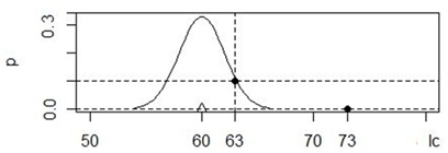 Рис. 1. Гауссиана с параметрами x = 60, s = 2 и оценка плотности вероятности p для значений 63 и 73 мм